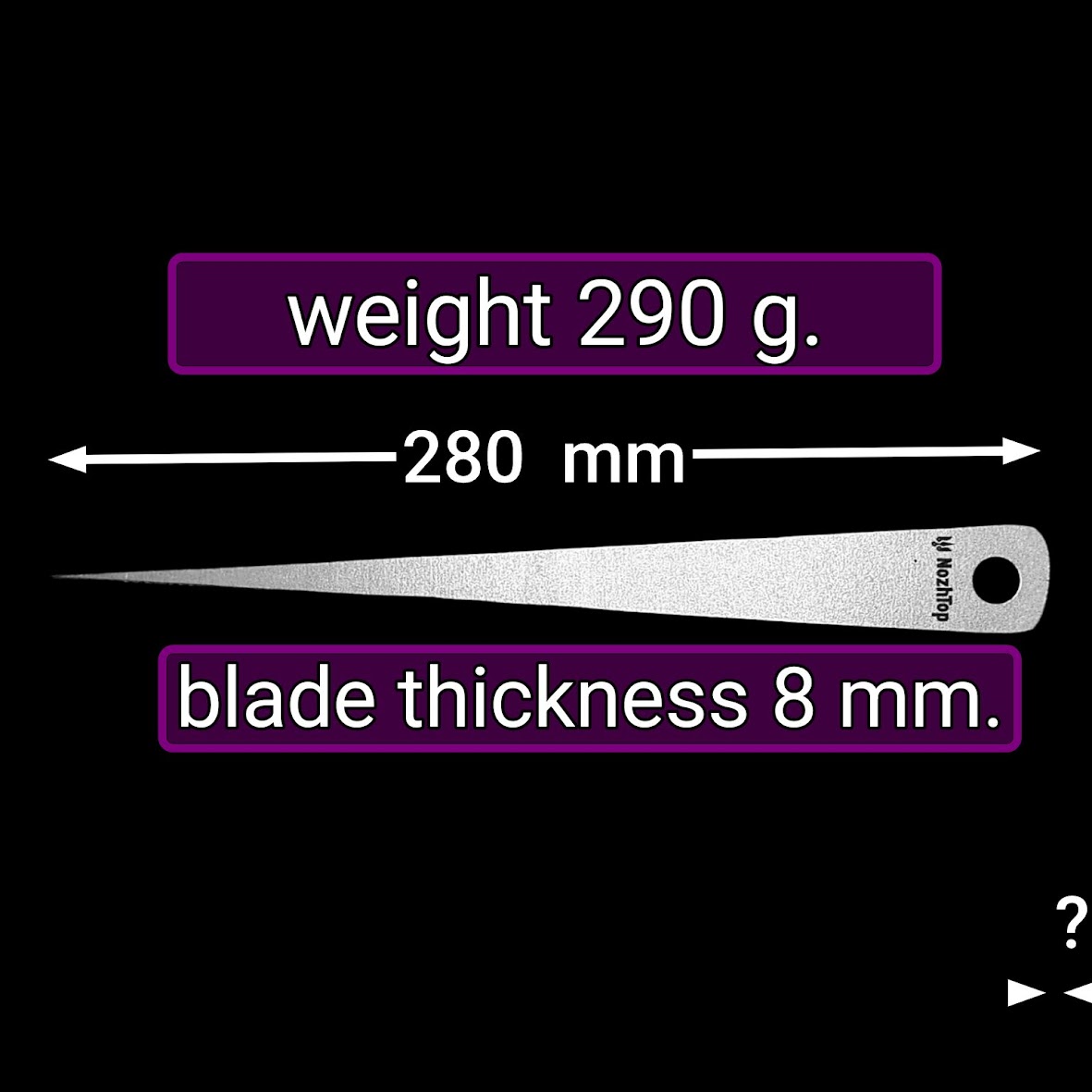 - Drei identische Wedge-Wurfmesser - 290g (10.2 oz), 280mm (11 in), 8mm dick, handgefertigt aus Kohlenstoff-Federstahl