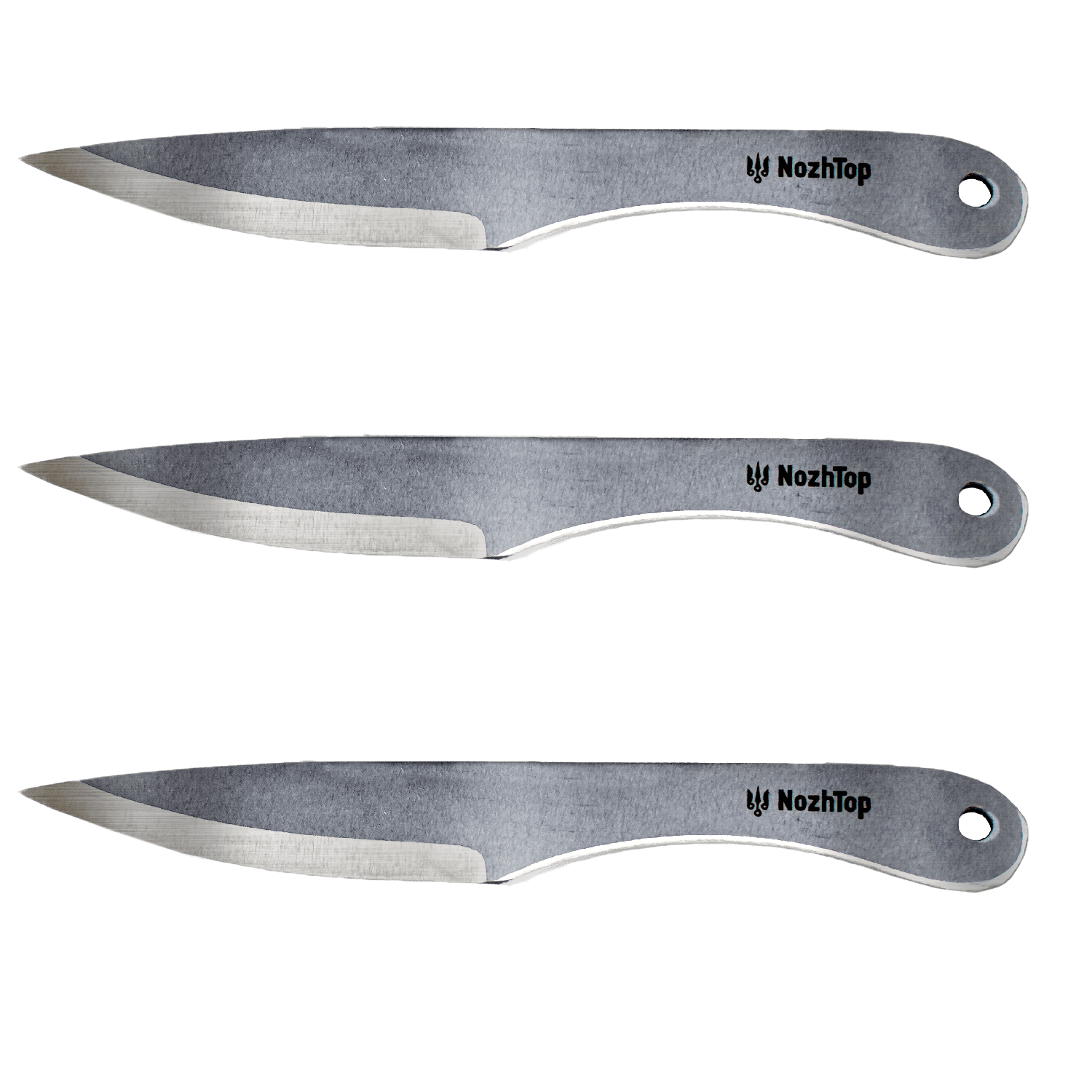 Les couteaux sont fabriqués en acier à ressort suédois de haute qualité, choisi pour son excellente élasticité et sa résistance aux chocs. L'ensemble comprend trois couteaux gravés en couleur et un étui en cuir de style sportif pour un transport et un rangement pratiques. Malgré son poids conséquent, l'Osetr est facile à manipuler, même pour les débutants, les femmes et les jeunes sportifs.